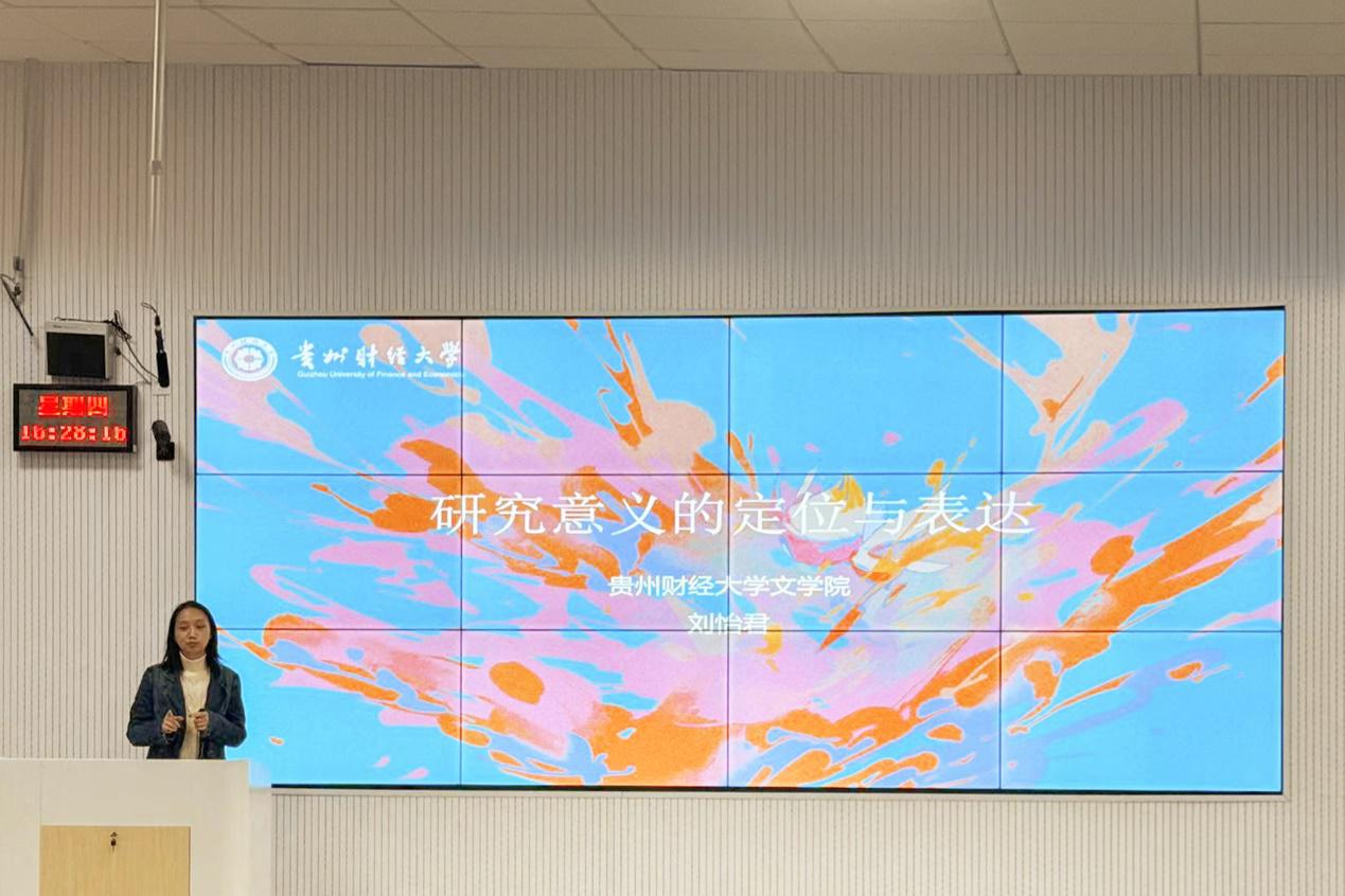 刘怡君的主题是《研究意义的定位与表达》。首先,她向同学们介绍了研究意义的内涵,并指出其对应了论文框架中的引言、文献综述和结论。引言的作用是把题目转换为一个值得研究的问题,并对其现实意义和学术意义进行概括性介绍;文献综述的作用是说明论文和已有文献的关联;结论的作用是阐释论文对已有理论的扩展或对实践的建议。