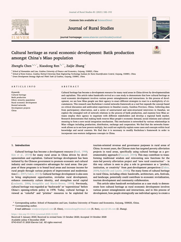陈正府老师以第一作者的身份在国际权威学术期刊 《Journal of Rural Studies》发表重要的学术文章《Cultural Heritage as Rural Economic Development: Batik Production Amongst China’s Miao Population》(SSCI一区,收录号:000609218200002),目前已可在线查阅和下载。该研究以国家级非物质文化遗产贵州省丹寨苗族蜡染手工技艺为个案,借用“Rooted Networks(根植性网络)”概念对蜡染生产中所涉及人、物、地方和实践关行进行了深度分析与阐释。