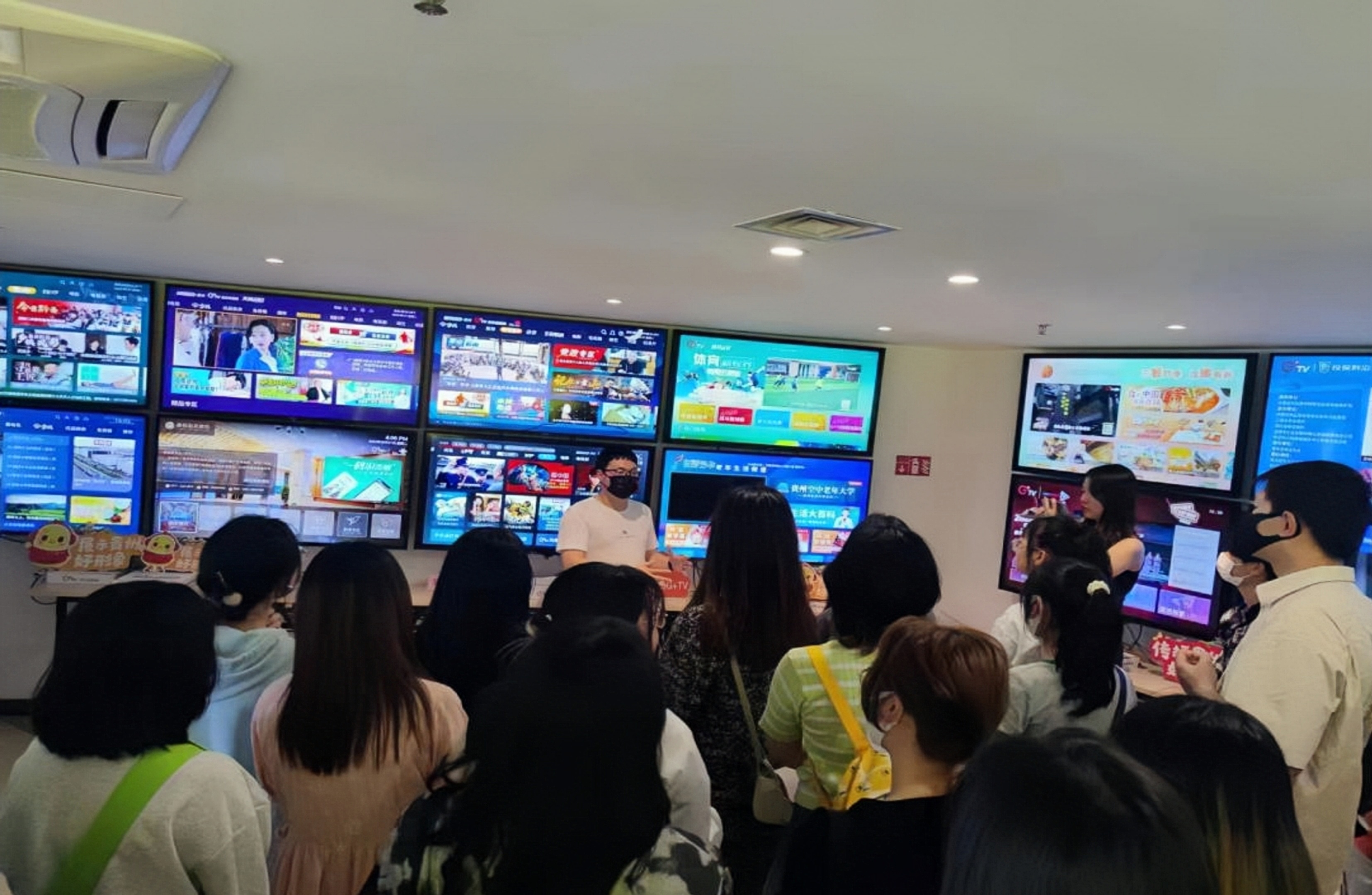 贵阳网络视听产业园工作人员带领师生认真参观了贵阳网络视听产业园区,重点向师生介绍了G+TV贵州多彩新媒体中心运营流程、工作原理、岗位分工和相关成果,并就学生提出的相关问题进行解答。
