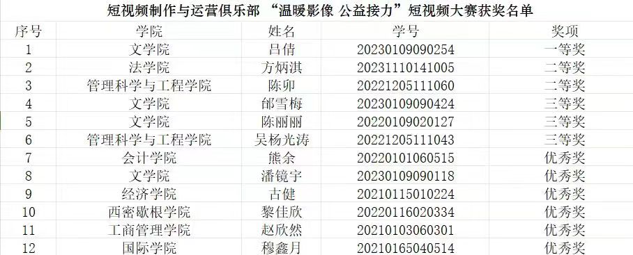 本次活动作品评审人员有迟林晨老师、俱乐部成员与学生代表。比赛共评选出一等奖1名,二等奖2名,三等奖3名,优秀奖6名。荣誉的获得不仅是对选手们辛勤付出的肯定,更是对他们关注和未来参与公益事业的鼓励。