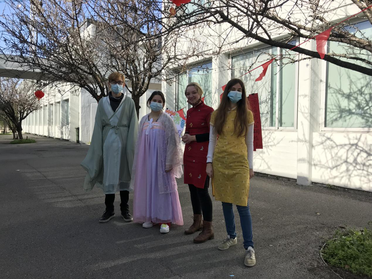1月25日是中国北方小年,作为春节的序曲,邵正兰同学组织中文班学生用活动海报、红灯笼、中国结、窗花、福字装饰校园,使整个校园充满的浓厚的节日气息。活动当天,学生先后体验了写福字、写对联、剪窗花、中国汉服和旗袍、手工制作红包、中国结编织技艺等活动,参加活动的师生均获得邵正兰手工编织的纪念手链。应参与活动师生需求,还增设“取中文名”环节,非中文班活动参与者都有中文名级书法作品。在活动作品展示区域,学生们穿汉服和旗袍拍照,福字、对联、剪纸、红包等作品挂满走道,图书馆也增设了中文书籍专栏,引起师生们不断驻足围观。三位校长参观活动现场并体验活动项目,也向邵正兰同学竖起了大拇指。