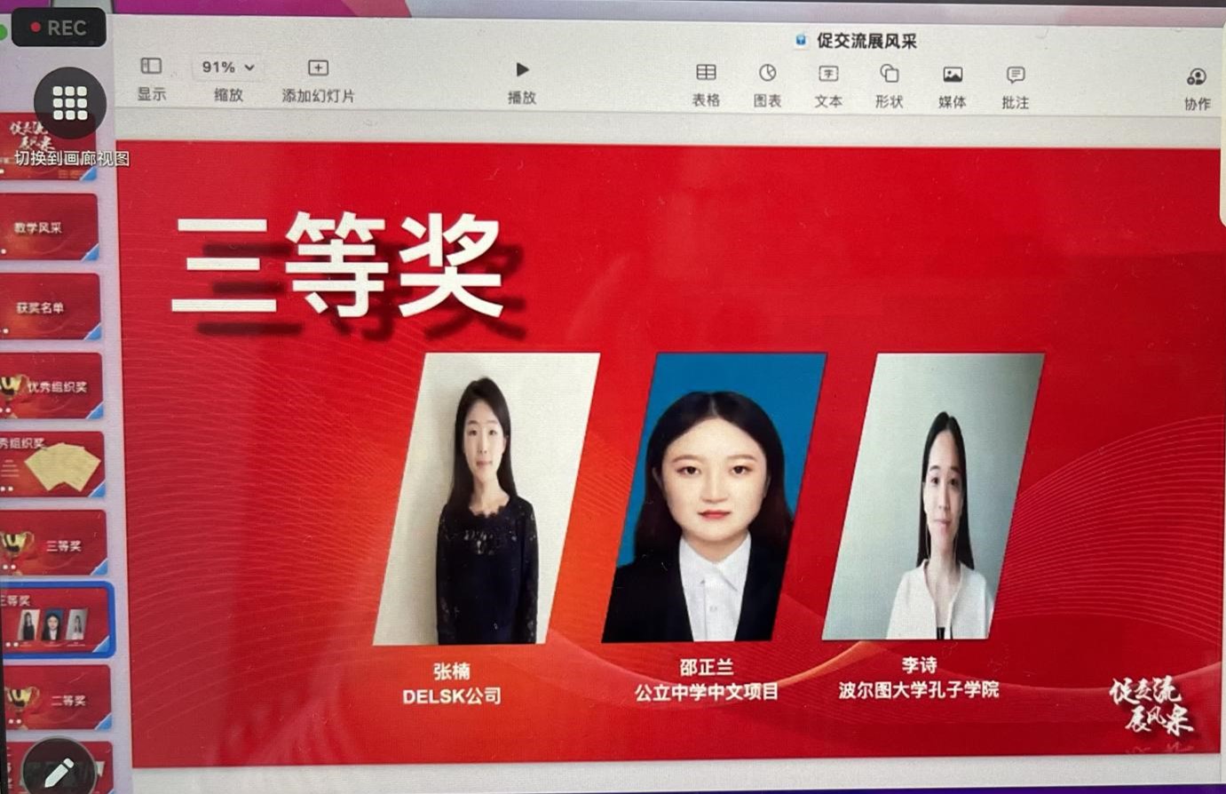 本次中文教师教学技能展示活动有来自葡萄牙10个中文教学单位35名中文教师参与,最终评选出一等奖两名,二等奖四名和三等奖三名。色色动漫 2020级汉语国际教育硕士研究生邵正兰凭借生动有趣的教学设计和深入浅出的教学讲解步骤,最终取得三等奖的好成绩。(文字:刘怡君 | 图片:刘怡君)