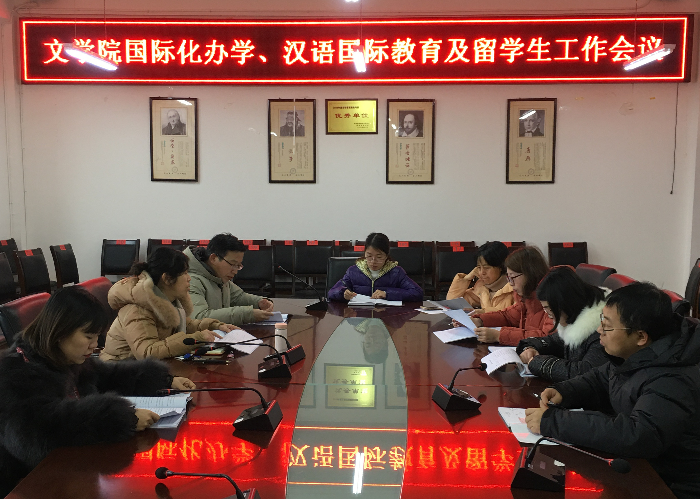 在文德楼318会议室召开国际化办学、汉语国际教育及留学生工作会议。会议由院长顾雪松主持,学院党委副书记文静、副院长周兴杰,以及汉语国际教育专业梁吉平、武晓丽、杨荔薇、齐菲等博士参加了会议。