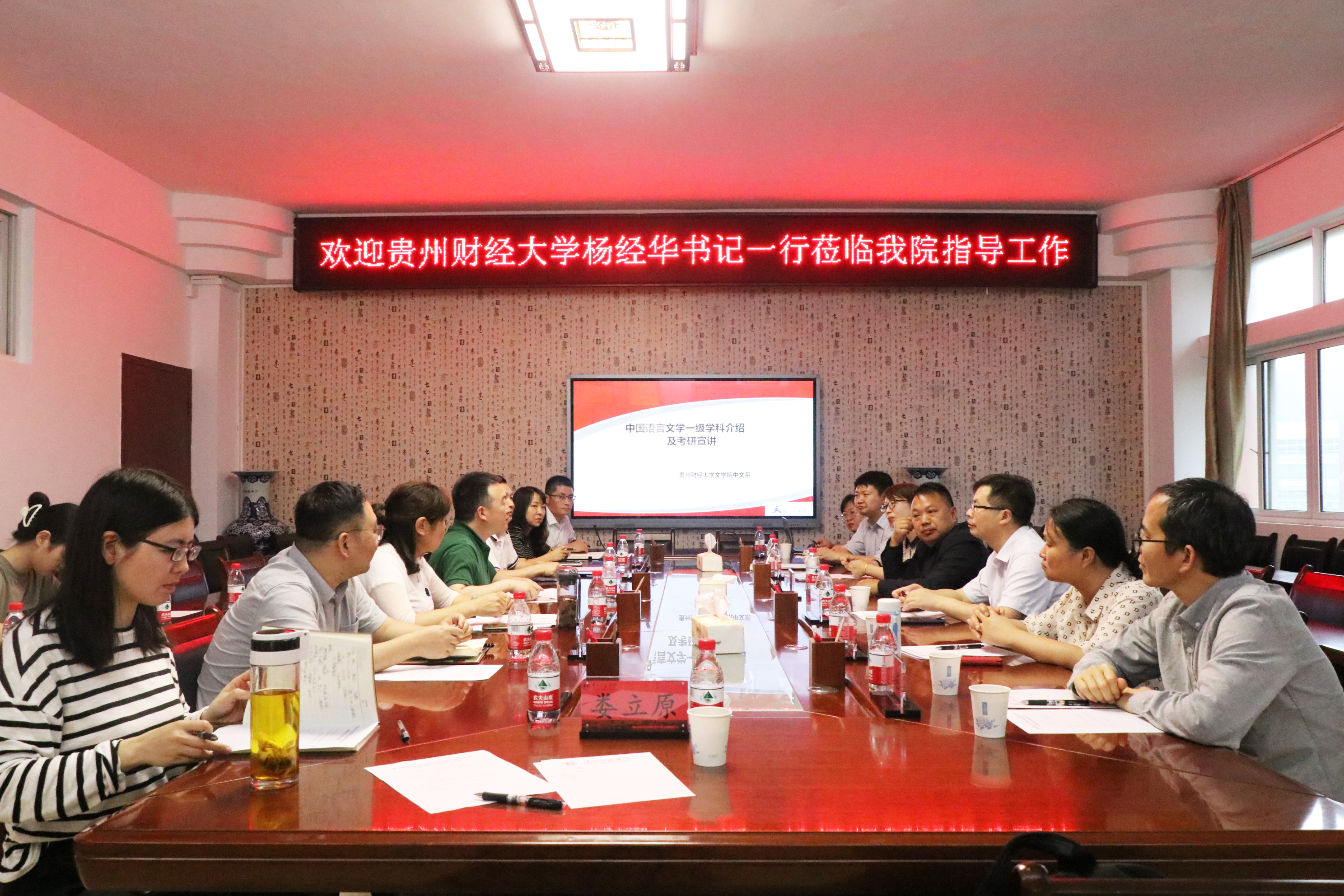 语言学及应用语言学专业导师组组长翟会锋、汉语国际教育专业负责人武晓丽、新闻传播专业负责人张武桥、中国现当代文学专业导师组组长陈祖君、古代文学专业硕士导师李黎、学科办主任王翌及学生代表参加活动。贵州师范学院文学与传媒学院党委书记王军、院长杨波热情接待杨经华一行。