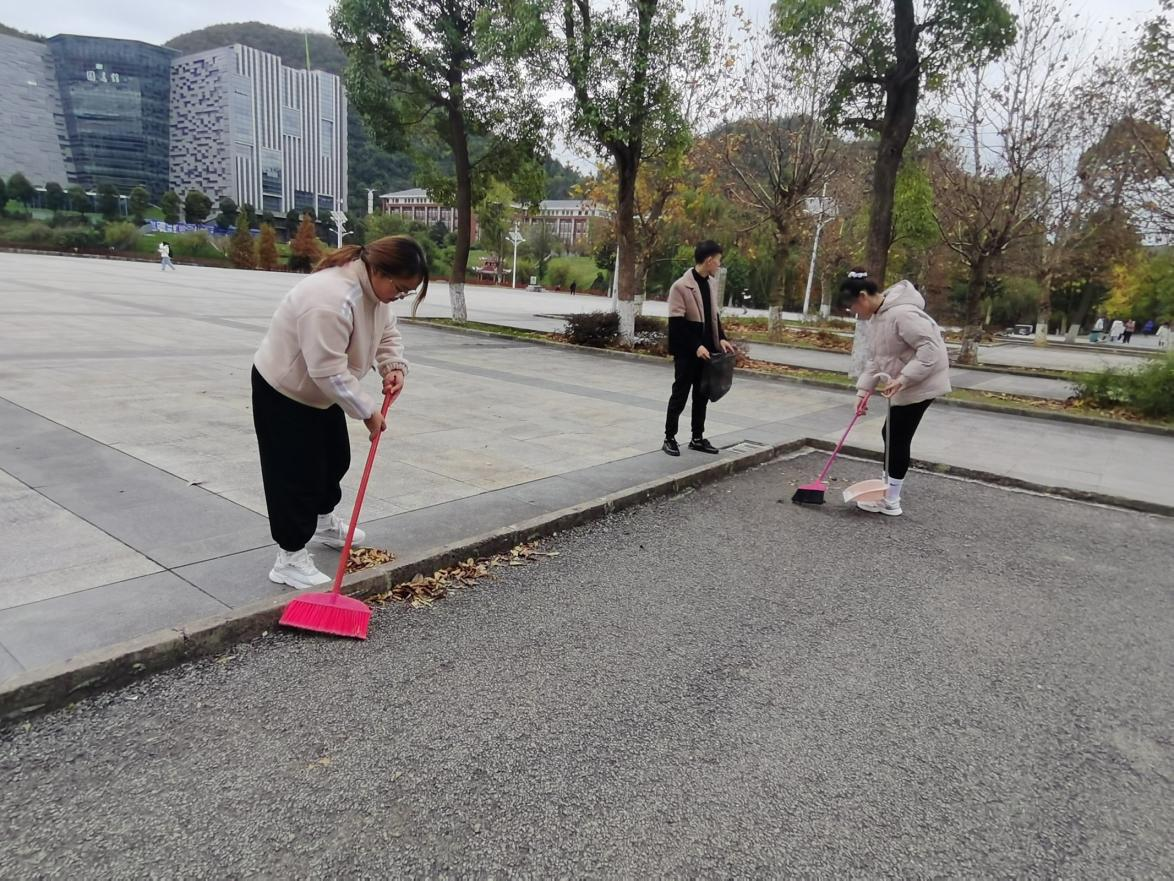 于11月10开展“金秋扫落叶,志愿伴我行”劳动教育实践活动,清扫区域为图书馆至立德楼道路以及鼎新湖广场。本次活动由院青协承办,共计67名学生参与。