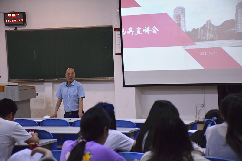 于5月18日下午七点在进学楼2-1成功举办了征兵宣讲会。本次会议特邀请了校武装部国防教育科胡老师进行征兵宣讲。