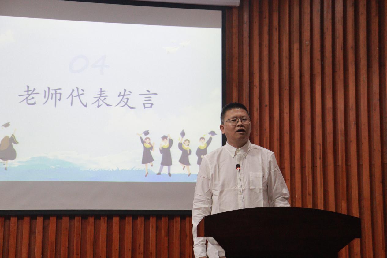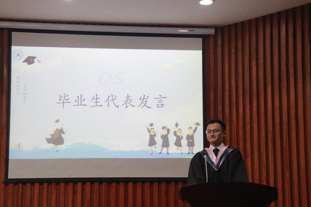 教师代表陈正府发言,他鼓励同学们成为自己的光,不要放弃自己的梦想,勇敢面对新的挑战,表达了对毕业生的殷切期盼。紧接着毕业生代表周光正发言,回忆大学的美好时光,传递对学校、学院的感恩和对同学们的不舍,并立志今后将继续坚守“厚德、博学、笃行、鼎新”的校训。