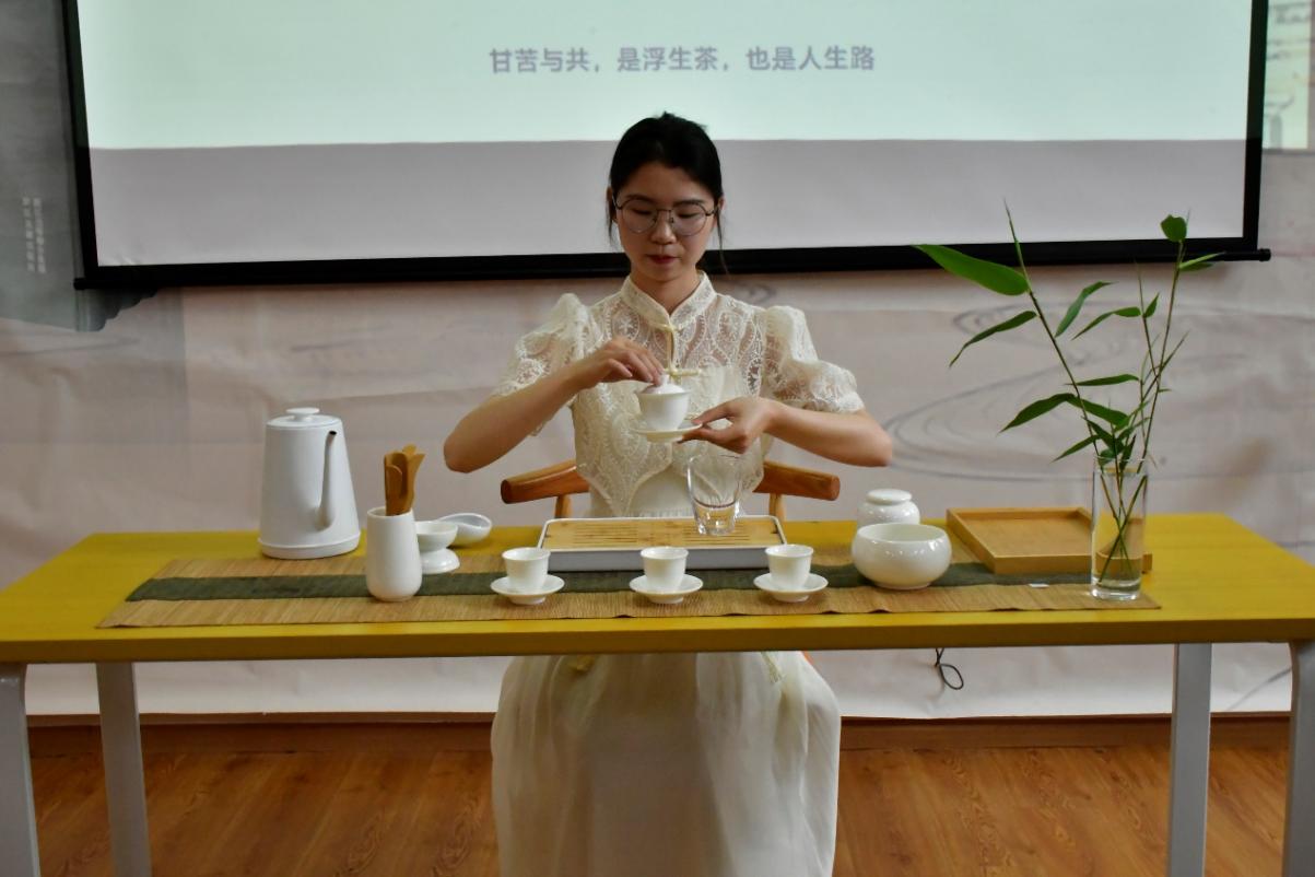20级汉语言文学班陈静为大家讲解茶文化的发展历程,现场进行茶艺展示,师生共同参与,深刻体会茶人之交醇如茶的道理。