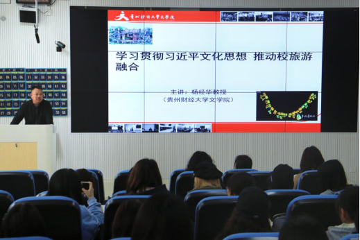 杨经华以“学习贯彻习近平文化思想,推动校旅游融合”为主题,从文化自信、民族融合、遗产保护及人才培养四个方面讲述。他深入剖析金筑土司历史与文化,探讨课题研究在遗产保护中的作用,以贵阳文化品牌为例,强调品牌传播对地方文化故事及城市影响力的提升。他指出同学们要尊重历史,保护文化与生态,推进文化和旅游深度融合发展,增强中华文明传播力影响力。
