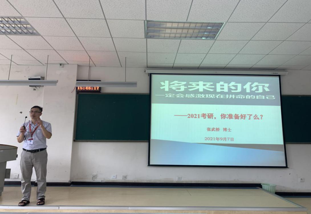 张武桥博士以向学生抛出“2021考研,你准备好了吗?”之问为引,结合自己对新闻与传播专业发展的理解,鼓励学生要以严谨和积极的态度面对每一次学习机会及人生选择,让学生坚信“将来的你,一定会感激现在拼命的自己”。