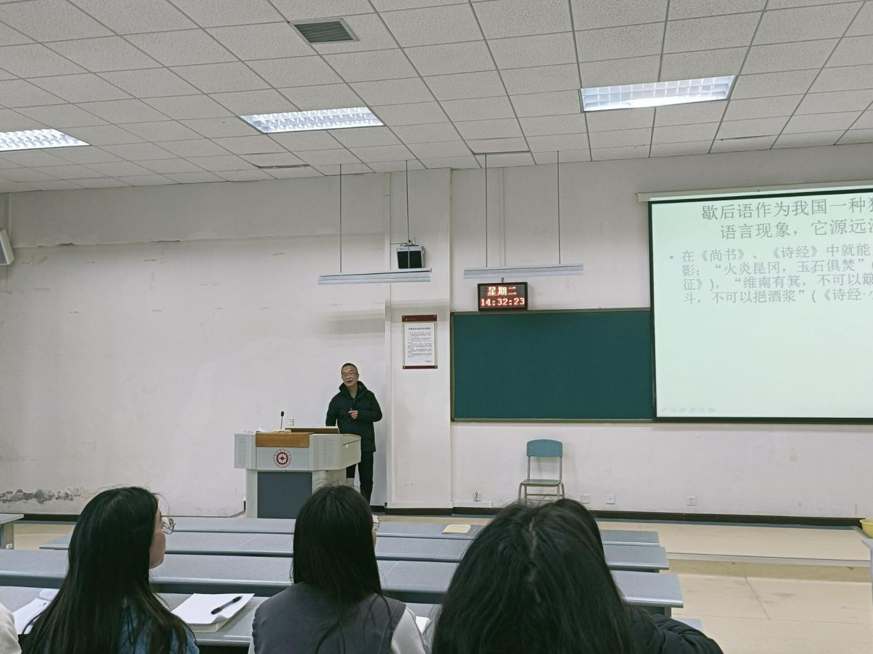 袁武老师向学生展示并介绍自己所收集的歇后语,联系实际生活对其进行深层次的解读,指出“歇后语是产生快乐的源泉”,提升了学生对歇后语研究的兴趣。